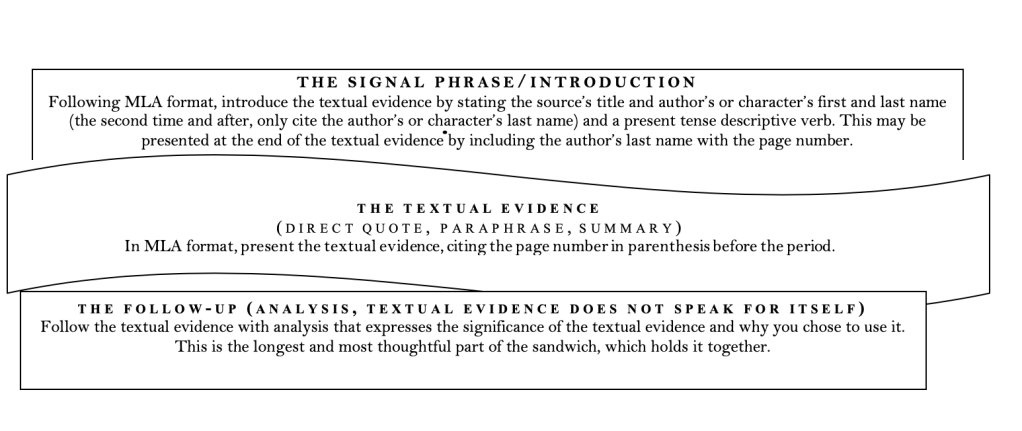 To do so, you lay down your first piece of bread and introduce the textual evidence with a signal phrase, then, cite the good stuff—cucumbers and cream cheese or cheddar and chutney—which is the textual evidence (summary, paraphrase, direct quote) that makes this sentence or two. Next, follow it up with the bread, which is your analysis and this is the most important part of the sandwich, for without the final piece of bread, the sandwich falls apart.
