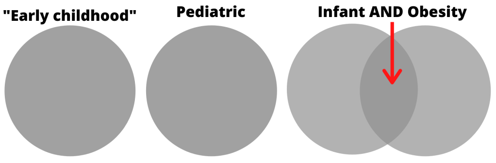 But if we add parentheses and search for (“Early childhood” OR pediatric OR infant) AND obesity: